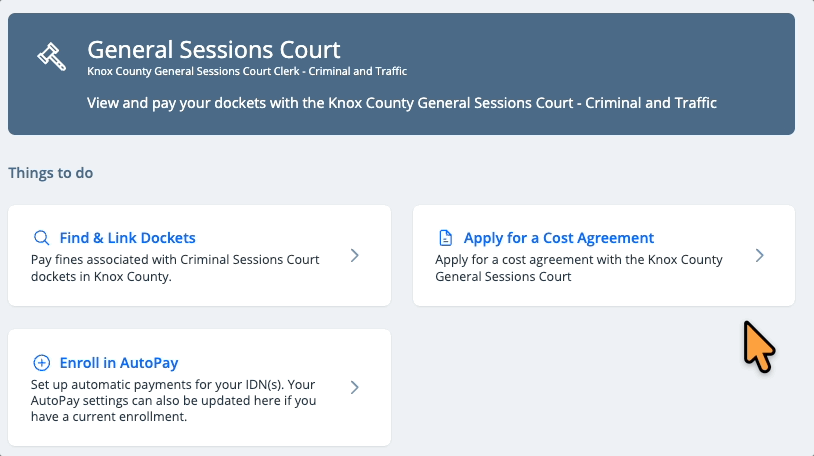 To get started with AutoPay, you’ll first need to create a KnoxCourtPay profile (see Create a Profile on KnoxCourtPay). Once you’re signed in and have linked your eligible case (see Add a Knox County Case on KnoxCourtPay), you’re ready to follow the steps below to enroll in AutoPay.